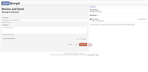 - Next is the screen that appears before your document is sent, this screen will allow the ability to ‘Review and Send’. Also, add any additional message to the recipient. When finished click on ‘Send Now’ to send the document.
