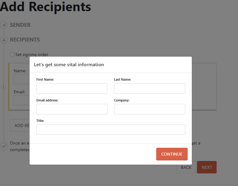- Next as the Sender, add in your Vital information into the few fields (Only if not logged into an account) and then click on ‘Continue’ to begin sending your document for a signature.