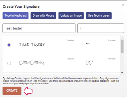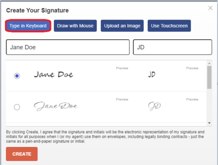 - First option, click "Type in Keyboard". Simply type your name then initials and several options of a cursive signature will appear to choose from. Select your signature style.