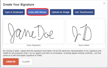 - Second option, click "Draw with Mouse". Simply draw your name then initials and a cursive signature will appear.