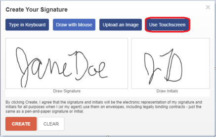 - Fourth, option, click "Use Touchscreen". Simply draw your name then initials and a cursive signature will appear.