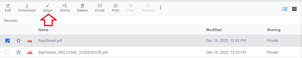 - To start you will land on a page titled "Documents", below that, click on the document you want to esign and a list of options will appear. Choose "Edit" and your document will open up.