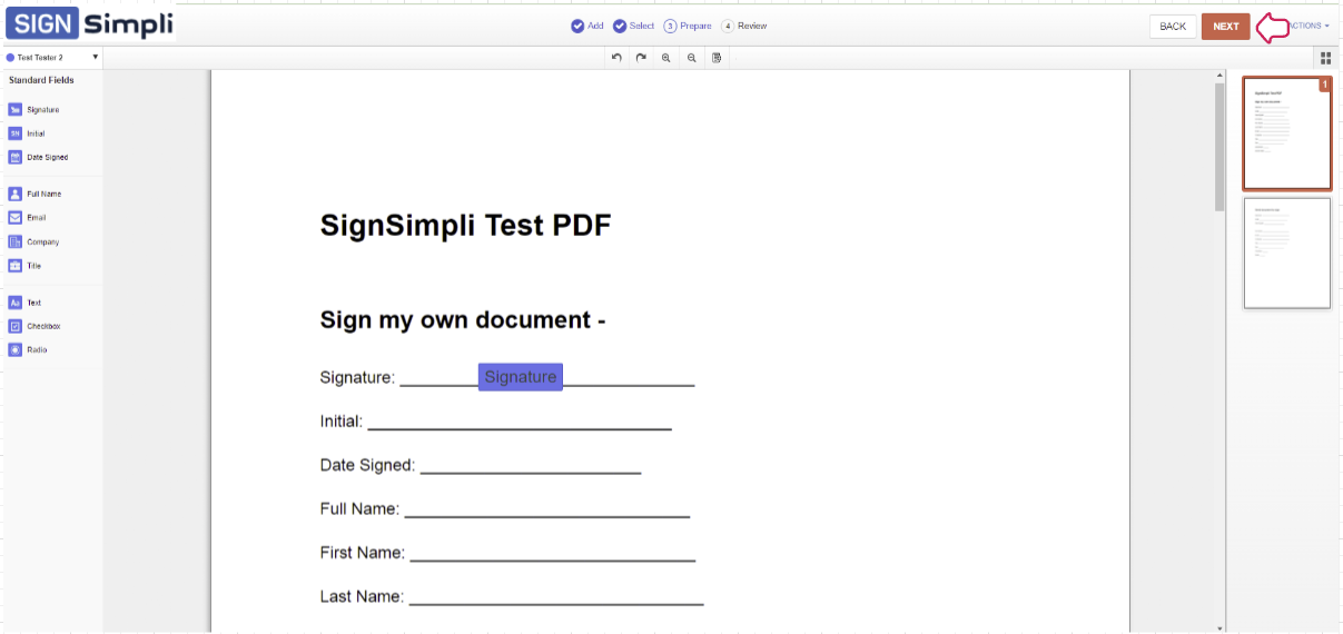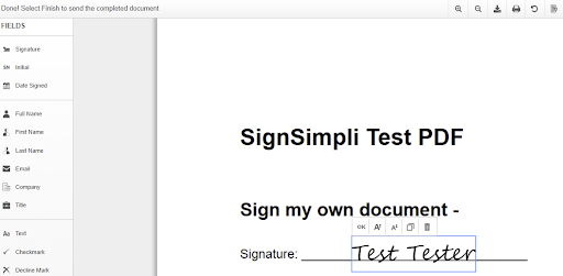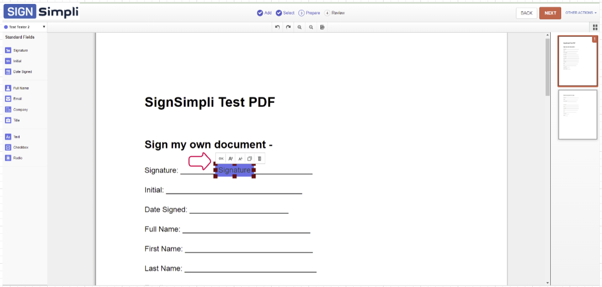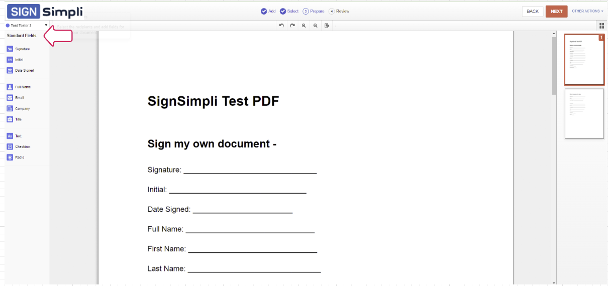 - First, from the Fields view ensure the correct signer is displayed at the top left corner of the screen. Note: To change signers, click the signer name field, then click the signer you want to apply fields for