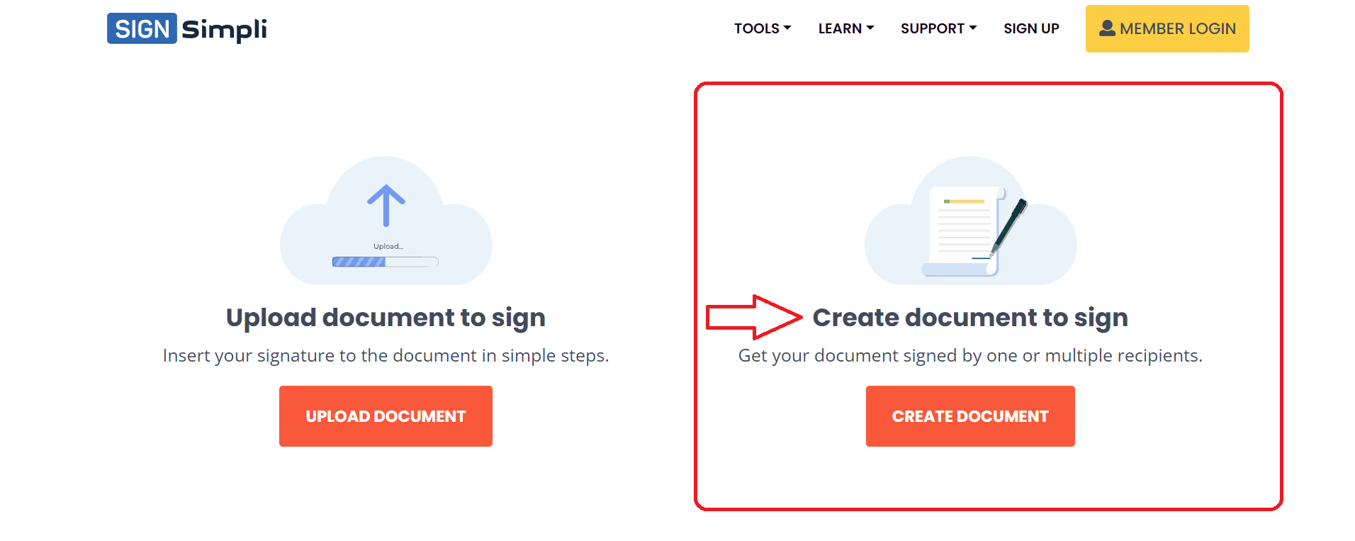 B. By selecting ‘Create Document to Sign’ on the next page, choose the correct document you would like to send for a signature and create a document from our library of legal forms.