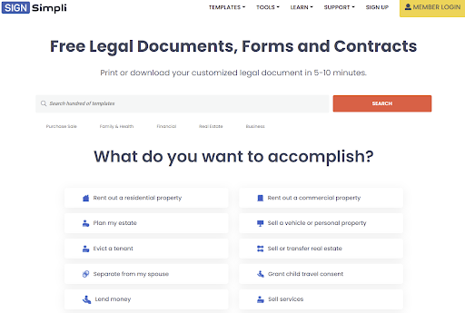 - Once on the next page, choose the correct document you would like to send for a signature and upload your document or create a document from our library of legal forms.