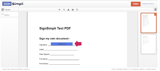 - Lastly, place the signature, resize and add other fields like initials, text and date. Next, click ‘FINISH’ to finalize the document.