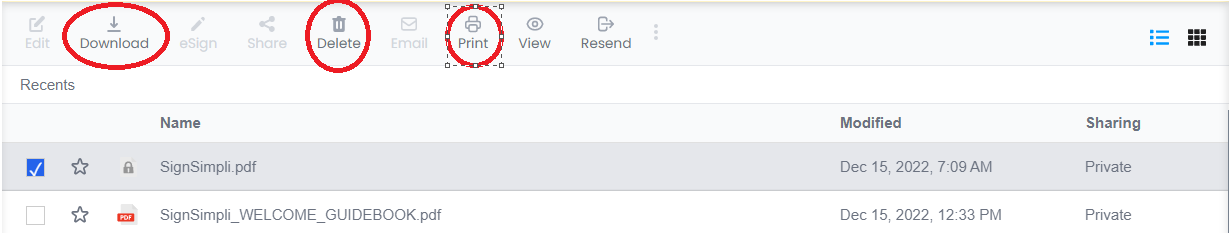 - Click on the document and a list of options will appear. You can Download, Print or Delete straight from this screen.